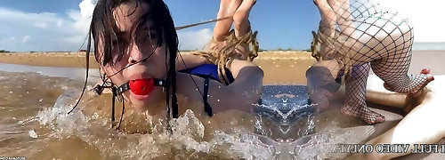 Ball Gagged Latina Tied Like A Hog In The Sea