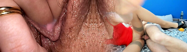 Hairy wife's moist pussy dripping juice on closeup shot of our amateur couple tape
