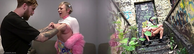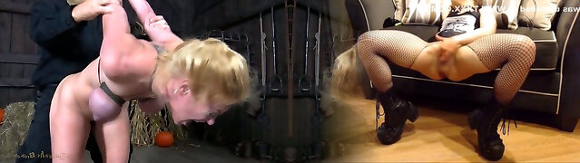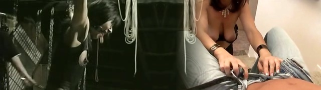 Grubby haired wild blonde is fixed in strappado bondage pose and gets penetrated