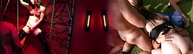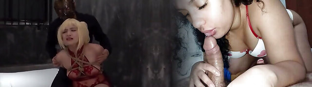 Lusty red haired nympho gets tied up and has to fellate two intense cocks