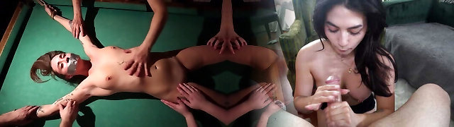 Submissive Slut Corded Up To the Pool Table Shakes With Sheer Pleasure Experiencing Guys' Hands All Over Her Body