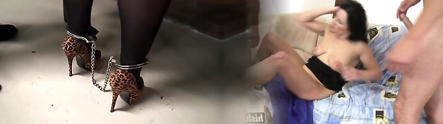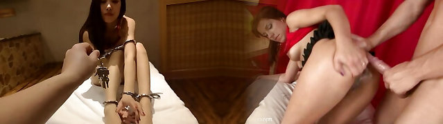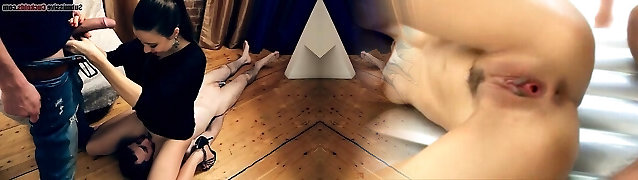 Slim submissive brunette gets handcuffed and domme teases her cunt