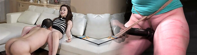 Asian mistress trains his slave not to get erections