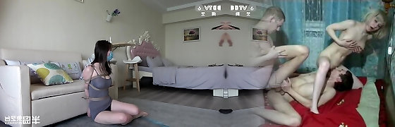 Two Chinese Girls Tied, One Dressed In Cloth Mask