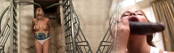Masked slaved ash-blonde in bondage yelling while her pussy is romped hardcore on staircase