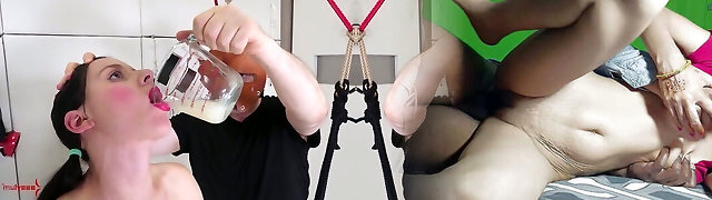 Hooded dude makes submissive tied up Audrey Holiday drink collected cum