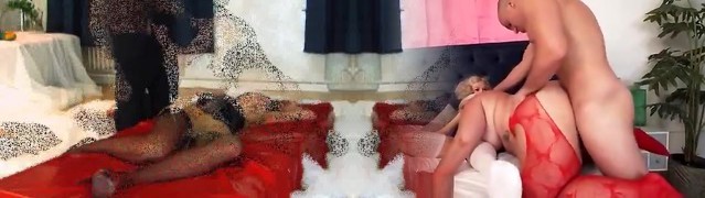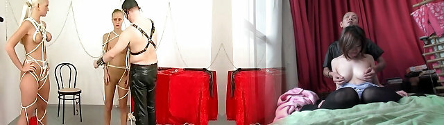 Three-way bondage sex with two babes tied up and pounded by masked fucker