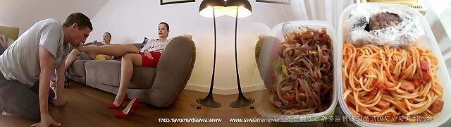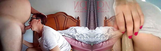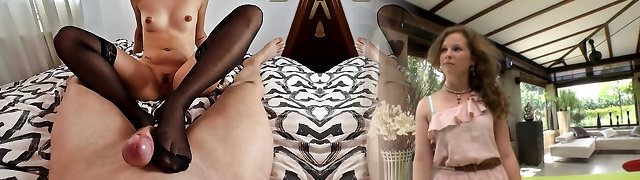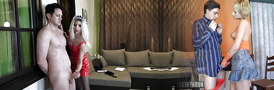 CFNM femdom ginger-haired teen stroking off a submissive man's dick