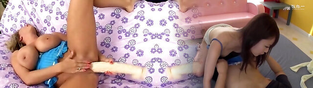 Asian teenage fucks her extremely pumped vag with big dildo and squirts