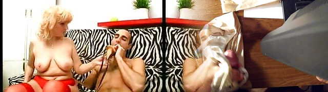 Dude sucks grannie's strap-on and gets booty fucked