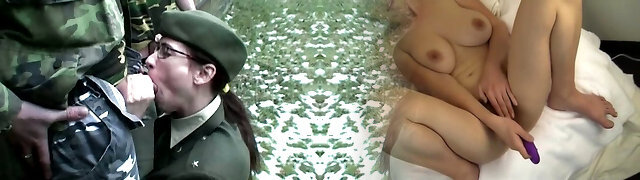 Ugly brunette Major Dita gives dual blowjob to two kinky soldiers in MMF sex clip