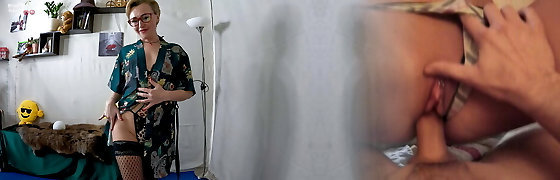 Perverted nerdy mature housewife gives BJ and screws rear end like pro