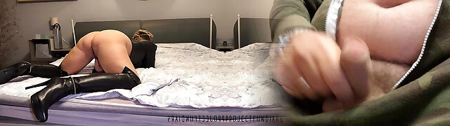 Domme wants his spunk on her thigh high boots