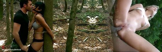 Bound up Chanel Preston gets her culo fucked in a forest