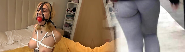 Big breasted tied up platinum-blonde MILF gets has to suck her master's cock