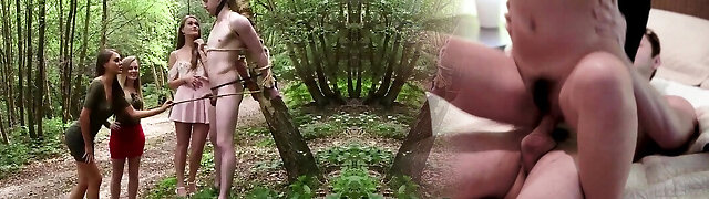 Insatiable girls found a tied up guy in the woods and licked every inch of his bone