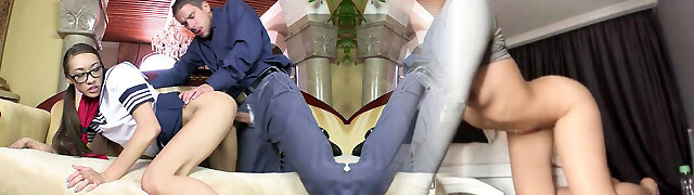 Tiny Four eyed teen Arial Rose gets her pussy stretched from behind rough