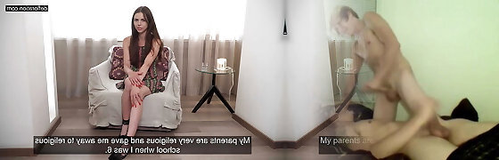 Passionate student attempts BDSM for the very first time, obediently fucked on all fours and gets cum on her face - Elena Ross