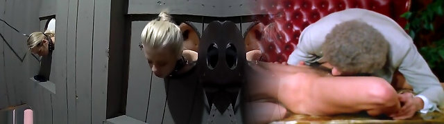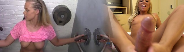Desperate blonde milf with faux boobs waits inside the gloryhole for a big rod to fellate and fuck