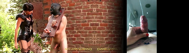 Dominant bitch Carmen Rivera savagely wanks cock of submissive dude