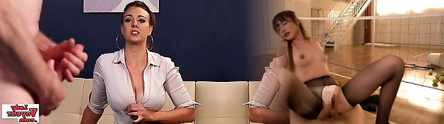 Gal Boss in Bare Pantyhose and High Heels Gives Femdom Handjob on Crossed legs
