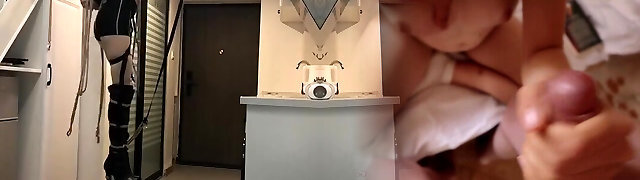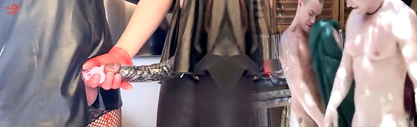 Middle-aged man got his butt polished with dildo and cord-on by expert dominant lady in black outfit