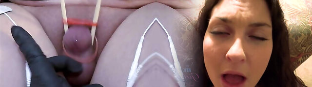 Femdom mistress ties subs balls and masturbates his cock into a glass