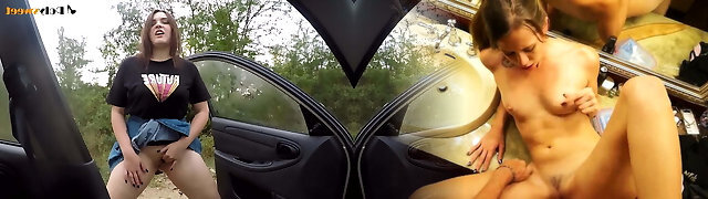 Public getting off of a brunette in a truck on the go.