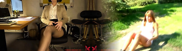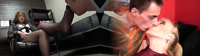 Kinky boss woman in nylon pantyhose pleasures her male secretary