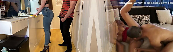 Stepmom pulled down her denim so I can jerk off and cum on her pantyhose ass