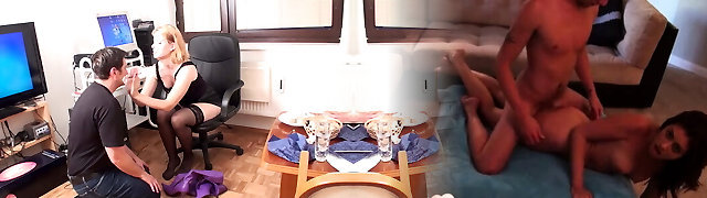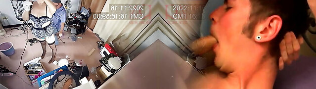A nude maid is cleaning up in an doofy IT engineer's office. Real camera in office.