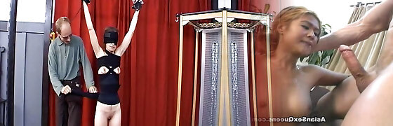 Trussed and hooded girl taking big beef whistle in her mouth – oral creampie