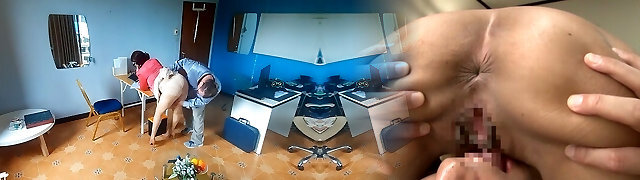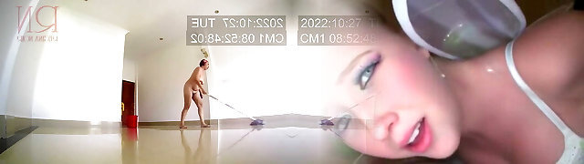 Naked maid cleans office space. Maid without underpants. Hall 1